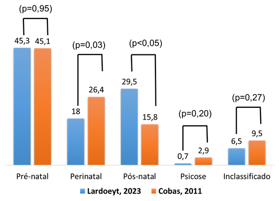 Al comparar los resultados con los descritos por Cobas,13 se mostraron diferencias en la etiología perinatal (p=0,03) resultando elevada en los estudios de Cobas y en la etiología posnatal (p=0,000) resultando elevada en la presente investigación. (Figura 2).
