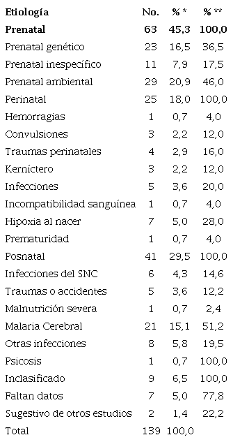 Teniendo en cuenta las principales categorías, en la etapa prenatal, los que predominaron fueron factores ambientales que actuaron como posibles teratógenos representando 20,9 % de los casos analizados y 46 % dentro de la categoría, seguido de alteraciones o daño en el genoma que definen la causa prenatal genética. En la etapa perinatal, la hipoxia al nacer y las infecciones fueron las que más prevalecieron, siguiéndole en orden de frecuencia los traumatismos y las convulsiones. En la etapa posnatal, la malaria cerebral constituyó ser la evidencia más frecuente, siendo además la tercera causa entre todas las categorías, precedido por la prenatal genética y prenatal ambiental. El resto de las causas, la psicosis y el inclasificado se muestran en la Tabla 1.