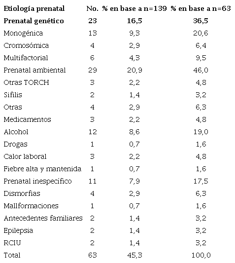 Los resultados de la etiología prenatal ambiental no se corresponde con el obtenido por Taboada y cols.,16 Portuondo Sao y cols.,17 Lardoeyt y cols.,14,18 y Arguello JM y cols.8 en los que más de la mitad de los casos obedecieron a la categoría prenatal genética y la causa prenatal ambiental ocupa un tercer lugar.