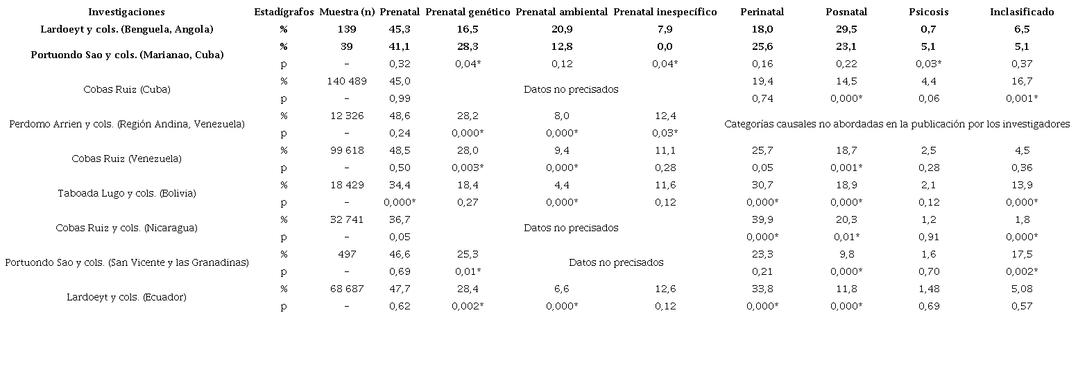 Finalmente, si se agrupan los resultados de los seis países como los refirió Cobas y cols.13 y se comparan con los de la presente investigación, son similares en la etiología prenatal (p=0,95), psicosis (p=0,20) e inclasificado (p=0,27).