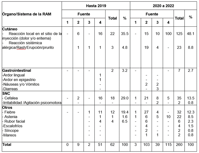Resultados: Hasta 2019 con un estimado de casi 35 mil pacientes expuestos al medicamento se tenía el reporte de 62 RAM para 0,18 % de frecuencia. Desde enero de 2020 con un estimado de 238 mil pacientes expuestos, se reportaron 260 RAM para una frecuencia de 0,11 % significativamente menor que en el período anterior (p<0,001). De acuerdo con estas frecuencias en ambos períodos se clasificaron las RAM como ocasionales o infrecuentes. No se reportaron reacciones graves ni se evidenciaron nuevos problemas de seguridad. Continúan siendo las reacciones locales en el sitio de administración, la cefalea y la fiebre las RAM más frecuentes.