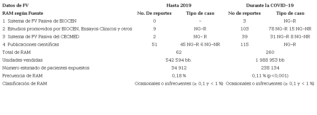 Tanto antes como después de la COVID-19, la bibliografía fue la fuente que aportó el mayor número de RAM, lo que alerta sobre la necesidad de su revisión constante. Después de la COVID-19, la segunda a la bibliografía como fuente de RAM, los estudios promovidos por BioCen, lo que está en consonancia con la mayor cantidad de ensayos clínicos y estudios de intervención con el producto, realizados en esta etapa, lo que se visualiza en el Registro Público Cubano de Ensayos Clínicos.22