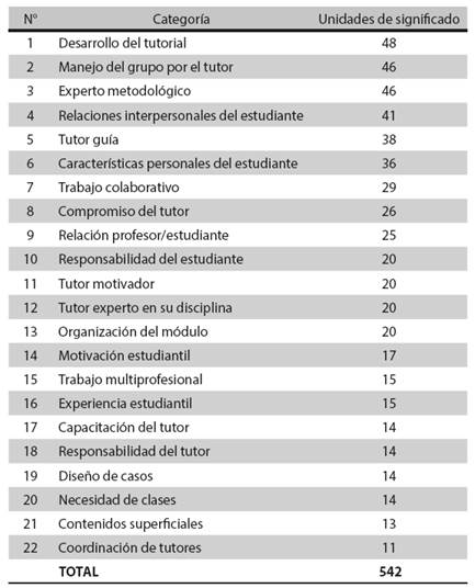 En el análisis de contenido se identificaron en total 574 unidades de significado (US), 542 de las cuales se agruparon en 22 categorías descriptivas (Tabla 1). Las categorías más destacadas fueron: Desarrollo del tutorial (48 US), Tutor como experto en la metodología y Manejo del grupo (46 US cada una), las que apuntan a las competencias propias del tutor. También los estudiantes asumen la importancia del propio rol en la metodología, considerando entre otras sus Características personales (36 US), Responsabilidad (25 US) y Motivación (17 US), como factores relevantes del proceso tutorial.