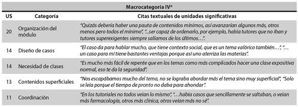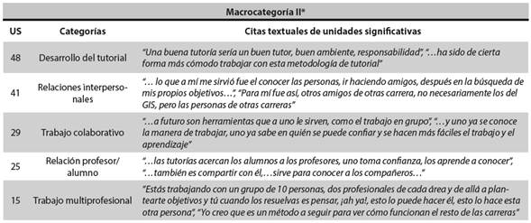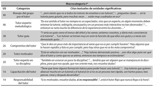 La Tabla 2 describe la conceptualización de la macrocategoría I, las categorías que la conforman y el número de US, como las citas textuales que la representan. Entre ellas los estudiantes señalan que hay características distintivas y necesarias del profesor en su rol como tutor; 224 de las 542 US (41,3 %) y 8 de las 22 categorías se refieren a cualidades relacionadas con el tutor.