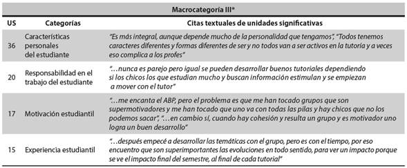 La tercera macrocategoría ''Características y participación de los estudiantes'' (Tabla 4), se relaciona con la experiencia, actitud y características personales de los estudiantes que juegan un rol decisivo en el funcionamiento del ABP, sostienen que ''…es más integral, aunque depende mucho de la personalidad que tengamos'', ''…depende si vienen motivados o no'', ''… todos tenemos caracteres diferentes y formas diferentes de ser y no todos van a ser activos en la tutoría y a veces eso también les complica a los profes''.