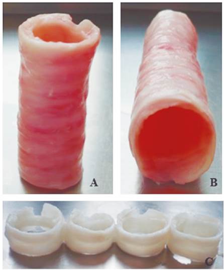 El estudio se efectuó previo aval del Comité de Bioética para Animales de Experimentación. Incluyó las tráqueas de 5 cerdos comerciales de raza Yorkshire, provenientes de la misma distribuidora de carnes, con un peso entre 20 y 30 kg. Las tráqueas se tomaron en horas de la mañana (8-10 a. m.) el día en que iban a ser procesadas, para evitar posibles sesgos asociados a su almacenamiento. Se las dividió en 8 segmentos, cada uno compuesto por dos anillos de cartílago, más el tejido fibroelástico que los une. A estos segmentos se los denominó probetas (Figura 1). De cada tráquea se seleccionaron aleatoriamente 4 probetas para someterlas al proceso de descelularización. Las 4 restantes se utilizaron como controles.