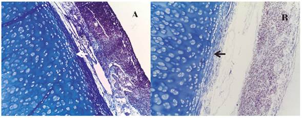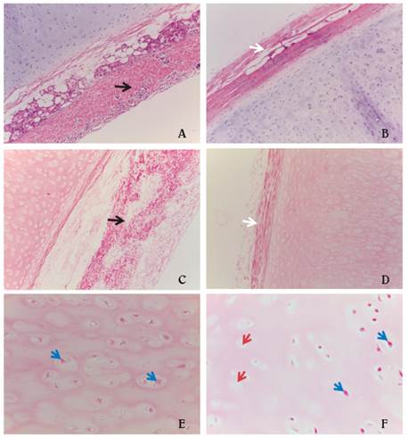 Se observó además una matriz hialina en la que no fue posible diferenciar las fibrillas colágenas tipo II, puesto que las enmascara la sustancia fundamental en la que están incluidas (Figura 5A). En las muestras tratadas se demostraron la preservación del colágeno y la arquitectura general de la matriz extracelular (Figura 5B).