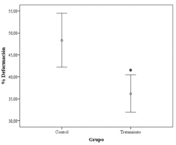 No se observaron diferencias estadísticamente significativas en el módulo de Young ni en la fuerza máxima aplicada al tejido. Por el contrario, el valor medio del porcentaje de deformación disminuyó de forma significativa en las muestras tratadas (Figura 7). Esto sugiere que el proceso de descelularización no afectó la elasticidad del tejido, ni la fuerza máxima que puede soportar antes de llegar a una deformación plástica. Sin embargo, disminuyó su capacidad para deformarse antes de llegar al punto de ruptura.