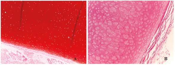 Se emplearon secciones de tráquea con las mismas características ya descritas teñidas con safranina O, para evaluar el contenido de glucosaminoglucanos (GAG), como marcadores de la calidad de la matriz cartilaginosa del tejido.
