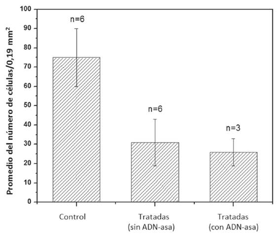 El análisis cuantitativo muestra una disminución del 66 % en el número total de células al finalizar el tratamiento. Es importante aclarar que no se hallaron células íntegras en la capa cartilaginosa, por lo cual se tuvieron en cuenta únicamente los detritos celulares (Figura 4).