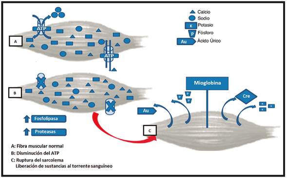 Los principales mecanismos fisiopatológicos que explican la rabdomiolisis son el trauma directo de la fibra muscular y la depleción del ATP muscular. En estado fisiológico la concentración de Na+extracelular se mantiene por el funcionamiento adecuado de la bomba Na+K+ATP-asa, que extrae sodio de la célula (5),(8); secundario a ello aumentan las cargas negativas en el espacio intracelular (recuérdese que el recambio es de 3 moléculas de Na+por 2 moléculas de K+). Durante el proceso de contracción muscular, el sodio entra a la célula intercambiándose luego por calcio (Ca++) mediante otro cotransportador de la membrana celular que también depende de ATP; de igual manera, la célula mantiene bajas concentraciones de Ca++(0,12 mmol/L) gracias a transportadores que introducen este catión al retículo sarcoplásmico y a la mitocondria (9). Cuando hay una lesión muscular se presenta isquemia tisular, que se explica por la disminución del flujo sanguíneo o porque las demandas de oxígeno superan los suministros; como consecuencia, se reduce considerablemente la producción de ATP lo que lleva al mal funcionamiento de los transportadores iónicos, con aumento de la concentración de sodio y calcio intracelular e intramitocondrial (1,27 mml/L) (9). El calcio, por su parte, activa la fosfolipasa A2 y las proteasas; además, ocasiona contracción muscular prolongada y disfunción mitocondrial (7); finalmente, hay ruptura del sarcolema (membrana celular muscular) y liberación de gran cantidad de componentes celulares al torrente sanguíneo (iones, mioglobina, tromboplastina), sustancias responsables de las manifestaciones clínicas de la rabdomiolisis (8) (Figuras 1y 2).
