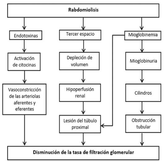 El daño renal secundario a rabdomiolisis se explica por tres mecanismos fisiopatológicos (10): constricción de vasos renales, lesión oxidativa mediada por la mioglobina y obstrucción tubular.