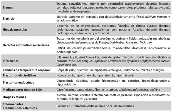 Para facilitar el estudio y enfoque de un paciente con rabdomiolisis se han establecido 8 categorías de causas o eventos iniciadores que se deben buscar minuciosamente para establecer un tratamiento oportuno; son las siguientes: trauma, ejercicio, hipoxia muscular, defectos genéticos, temperaturas extremas, infecciones, trastornos metabólicos o electrolíticos, drogas y toxinas (1),(7),(10)-(13) (Tabla 1). Entre ellas, las toxinas exógenas son la principal causa con repercusión clínica, responsables de hasta 46 % de los casos que requieren hospitalización (drogas ilícitas, alcohol y medicamentos prescritos) (4). Entre los medicamentos, los más a menudo implicados son las estatinas, los antipsicóticos, los inhibidores de la recaptación de serotonina y los antihistamínicos; con frecuencia la interacción de varios medicamentos es lo que desencadena el problema, como por ejemplo la combinación de estatinas con fibratos. Los defectos metabólicos del músculo son responsables del 10 % de los casos de rabdomiolisis y los pacientes portadores de estos defectos son los que más riesgo tienen de recurrencia o de que ciertos medicamentos o toxinas la desencadenen. Para tener en cuenta, en el 60 % de los casos interviene más de una causa y hasta en el 10 % no se encuentran factores de riesgo asociados.