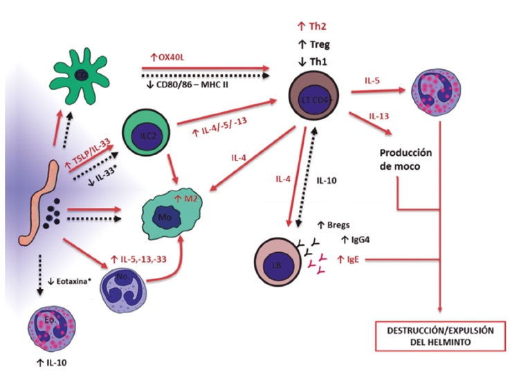 Es bastante amplio el espectro de células de la respuesta innata que están sujetas a inmunomodulación por helmintos. Incluso, en algunas infecciones helmínticas estas células son necesarias y suficientes para conferir inmunidad protectora frente al parásito (40), lo cual es de esperar dado que la vida parasitaria en los vertebrados antecede a la aparición de muchos de los componentes de la respuesta adaptativa propios de los mamíferos (41). El perfil de activación que adquiere una de estas células al ser estimulada por componentes del parásito difiere de las formas clásicas descritas y que son propias de otros tipos de infecciones, como las bacterianas. Varias de estas poblaciones son una fuente temprana y abundante de citocinas tipo 2 (33), muy importantes en la respuesta de defensa frente a los helmintos, pero que pueden modular la aparición de otros trastornos de la respuesta inmunológica (42).