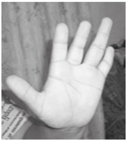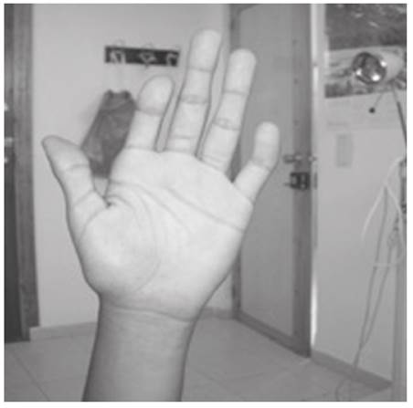 Varón de 26 años que, al igual que sus hermanos, presenta braquidactilia tipo A4 (Figura 5) que no ha sido estudiada. Tiene problema de salud relacionado con estado ansioso depresivo. Casado con mujer perteneciente también a la comunidad gitana, sin relación de parentesco con ella. Tienen tres hijos: dos varones y una niña afectada de parálisis cerebral infantil. Peso 75 kg, talla 179 cm, IMC 23,40.