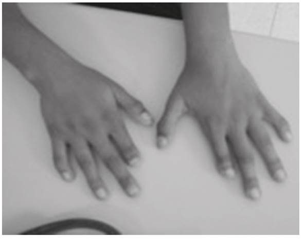 Mujer de 28 años con la misma anomalía de sus hermanos, braquidactilia tipo A4 (Figura 4). Casada a los dieciséis años, el marido a los veintitrés. Primera gestación a los 17 años, sin anomalías y a término con nacimiento de una niña. Esta ha sido su única gestación. Hasta el embarazo era delgada, aún no había debutado la clínica tiroidea, posteriormente ha presentado dificultades para concebir. Desde el parto mantiene un aumento progresivo de peso. Se detectó hipotiroidismo tras ablación tiroidea por bocio hipertiroideo; obesidad y dislipidemia, además de amenorrea. No refiere relación de parentesco con el padre de su hija, el cual informa no pertenecer a la población gitana. La hija nacida de esta relación presentaostium secundumy está pendiente de cirugía cardíaca. Peso 125 kg, talla 177 cm, IMC 39,89.
