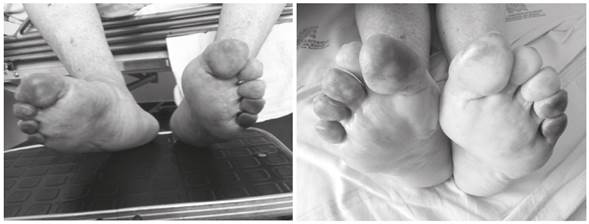 Al examen físico de ingreso se destacaba una significativa diferencia de presión en los miembros superiores: 160/70 mm Hg en el derecho y 116/70 mm Hg en el izquierdo. Los exámenes cardiopulmonar y abdominal fueron normales. En las extremidades inferiores había pulsos pedios y tibiales posteriores, pero eran débiles; la sensibilidad estaba conservada; los pies eran tibios con llenado capilar mayor de 2 segundos, había cianosis en los dedos de los miembros inferiores, de predominio en el quinto dedo del miembro inferior izquierdo (Figura 1). En el examen neurológico no se halló evidencia de déficits.