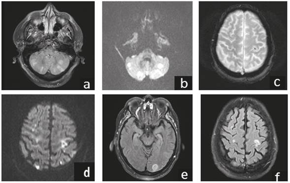 Por la estenosis de la arteria subclavia, se optó por el tratamiento endovascular. Durante el procedimiento no se pudo recanalizar la zona de estenosis ni implantar un estent. A las pocas horas de la intervención presentó deterioro del estado de conciencia, náuseas, vómitos, disnea, hipotensión, hipoxemia y taquicardia, asociadas a frialdad y palidez generalizada. Requirió tratamiento con cristaloides y vasopresores durante 45 minutos, se la estabilizó y remitió a la unidad de cuidados intensivos. En el examen neurológico se detectó monoparesia del miembro superior derecho. La hemoglobina después del procedimiento fue de 8 g/dL (previa: 10 g/dL). La tomografía axial computarizada simple de cráneo mostró áreas de infarto en diferentes territorios, al lado derecho de aspecto antiguo, y al izquierdo de aspecto subagudo en el territorio de la arteria cerebral media. En la resonancia cerebral simple y contrastada se documentaron múltiples áreas de restricción de la difusión en la corteza cerebelosa bilateral, las regiones occipital y parietal y en la corona radiada bilateral y los centros semiovales; en las secuencias de eco gradiente se observaron en el lado izquierdo pequeñas hemorragias occipitales y del área motora (Figura 2).