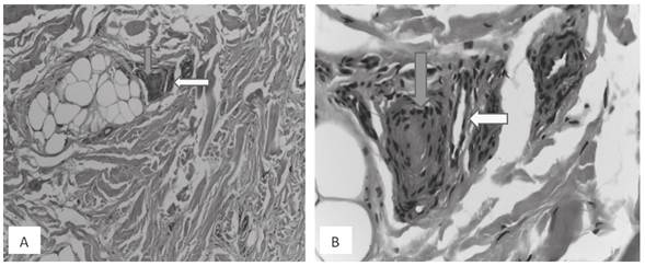 Por la sospecha clínica de ateroembolia o crioglobulinemia, se solicitó biopsia de piel de los dedos de ambos pies. El estudio patológico demostró cristales de colesterol en los vasos sanguíneos, lo que corroboró el diagnóstico de ateroembolia (Figura 3).