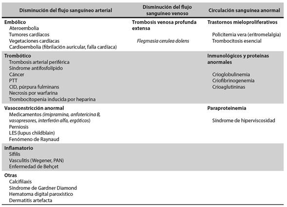 El síndrome del dedo azul se define como la aparición súbita de coloración violácea o azul en uno o más artejos, usualmente acompañada de dolor intenso, en ausencia de trauma, daño inducido por frío, hipoxemia o metahemoglobinemia (1). La coloración azul se debe al flujo sanguíneo lento con presión de oxígeno disminuida y al daño vascular con salida de eritrocitos a los tejidos. Los mecanismos fisiopatológicos son los siguientes: disminución de la perfusión arterial y del retorno venoso, anormalidades de la sangre circulante o aumento de la permeabilidad vascular usualmente por inflamación (1). En laTabla 1se presentan las causas de este síndrome.
