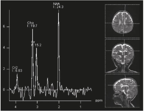 Las imágenes cerebrales, analizadas por un segundo neurorradiólogo, fueron informadas como sugestivas de noxa perinatal de posible origen hipóxico-isquémico; en los controles siguientes no se evidenció progresión de las lesiones, ni aparición de un patrón sugestivo de alguna de las leucodistrofias de origen metabólico (Figuras 1 y 2). La espectroscopia por RMC fue normal (Figura 3).