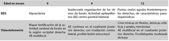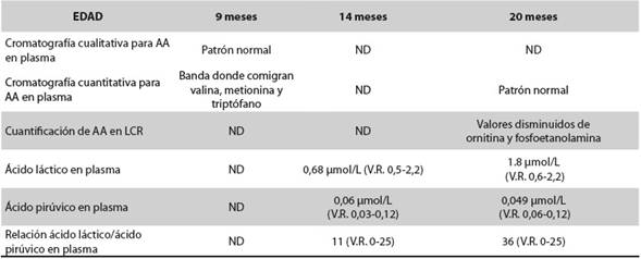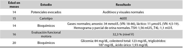 El desarrollo psicomotor estuvo alterado desde muy temprano, con sostén cefálico parcial a los 3 meses, cambio de posición supina a prona a los 9 meses, se sostiene sentado sin apoyo a los 17 meses, pero no ha logrado la marcha. Lenguaje: monosílabos. Al cuarto mes de edad presentó espasmos infantiles y se inició tratamiento con piridoxina y vigabatrín; ha tenido múltiples hospitalizaciones, mal control de las crisis epilépticas y presencia de otras crisis como ausencias, caída cefálica y focales motoras, por lo que fue necesario hacer ajustes en el tratamiento con vigabatrín, clobazam, ácido valproico y levetiracetam, con los que se controlaron los espasmos. A los 10 meses de edad no se evidenciaron en el examen alteraciones fenotípicas, organomegalias ni alteraciones óseas; perímetro cefálico 41cm (-3 DS), pares craneanos normales, reflejos musculotendinosos exaltados generalizados; sostén cefálico en posición prona inestable, no sedente, hipotonía generalizada. La paciente no ha presentado alteraciones sugestivas de un EIM del primer año de edad, a saber: cuadros de descompensación metabólica, alteraciones cardíacas o musculares, intolerancia alimentaria, compromiso visceral o hematológico u otras.
