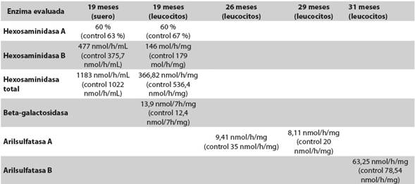 Los aminoácidos y los ácidos láctico y pirúvico en sangre y LCR fueron normales (Tabla 1). Pese al difícil control de sus crisis, ha tenido aumento del perímetro cefálico, a los 26 meses ya era de 46 cm (-1 DS), y adquisición de hitos del desarrollo, logrando a los 29 meses respuestas protectoras simétricas en posición sedente, postura de cuadrúpedo, bipedestación con apoyo, bisílabos con intención comunicativa. Las funciones auditiva y visual fueron normales. En las primeras imágenes de resonancia magnética cerebral (RMC) se observó leucoencefalopatía peri- y paraventricular y en los centros semiovales y dilatación leve del sistema ventricular, hallazgos interpretados como una posible leucodistrofia, por lo que se ampliaron los estudios en busca de enfermedad lisosomal. Se midieron los niveles de hexosaminidasas A y B, gangliósidos GM2 y beta-galactosidasa, para gangliósidosis GM1; y los de arilsulfatasas A (ARSA) y B, para leucodistrofia metacromática (LDM) y mucopolisacaridosis tipo VI (Tabla 2). Los niveles leucocitarios de ARSA estuvieron ligeramente disminuidos, pero dentro del rango de normalidad para la población general; se hicieron dos mediciones con resultados de 9,41 nmol/h/ mg y 8,11 nmol/h/mg (Tabla 2). Estas cifras equivalen a un porcentaje de actividad residual entre 30 % y 50 % del control normal. En general, se considera que las enfermedades de depósito lisosomal se expresan cuando la actividad residual de la enzima no supera el 10 % frente a los controles normales.