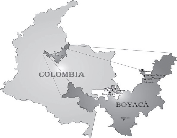 Estudio de corte transversal en el programa de vigilancia de Chagas gestacional implementado por la Secretaría de Salud de Boyacá (SSB) a través del Laboratorio Departamental de Salud Pública (LDSP), durante los años 2012 y 2013, en 12 municipios de zona endémica pertenecientes a tres provincias del departamento, así: de la provincia del norte Soatá, Covarachía, Tipacoque, Boavita, Susacón y La Uvita; de la provincia de Ricaurte Chitaraque, San José de Pare, Moniquirá, Togüi y Santana; y de la provincia de Lengupa el municipio de Zetaquira (Figura 1). Participaron 566 mujeres embarazadas que asistieron al control prenatal en las instituciones prestadoras de salud (IPS) de los respectivos municipios.