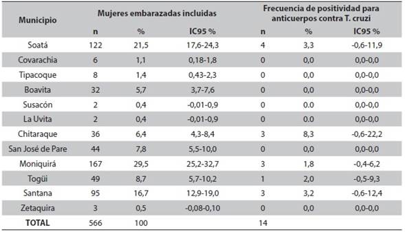 Materials and methods: Cross-sectional study of 566 pregnant women from endemic municipalities of Boyacá. Samples were analyzed by means of serological tests for Chagas, namely: IgG ELISA, indirect immunofluorescence and indirect hemagglutination. Cases with positive results in two tests were considered as confirmed.