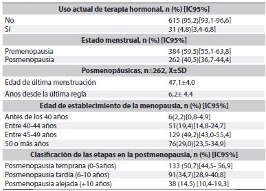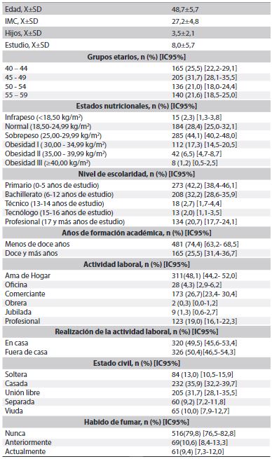 En la tabla 1 las características sociodemográficas. Edad 48,7±5,7 años, 3,5±2,1 hijos y el 67,6% actualmente unidas. IMC 27,2±4,8, estando el 69,1% en obesidad o sobrepeso. Nivel de escolaridad 8,0±5,7 años, teniendo el 42,2% nivel primario mientras que el 22,7% habían realizado estudios tecnológicos o profesionales. La cuarta parte tenía doce o más años de escolaridad. El 48,0% cumplían labores de ama de hogar y el 26,7% comerciantes. El 9,4% declararon ser fumadoras y el 4,8% utilizaban terapia hormonal. El 40,5% en posmenopausia, siendo edad de última menstruación 47,1±4,0, la mitad en posmenopausia temprana y el número de años desde la última menstruación fue 6,2±4,4.