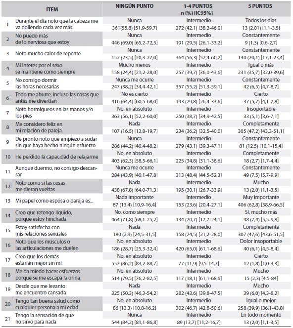 El alpha de Cronbach encontrado para EC: 0,819. Las manifestaciones que hacen referencia a las oleadas de calor fueron las más frecuentes: 76,4% informó oleadas de calor de repente, 73,1% notaban sofocaciones y 55,8% sudoración sin hacer esfuerzos. El 71,3% se quejaban de dolor músculo/articular, mientras que 43,9% de hormigueo en manos/pies. El 50,4% notó mayor sequedad de piel, 61,8% no conseguían dormir suficientemente, 56,1% dormían pero no descansaban y 49,7% desde que se levantaban se encontraban cansadas. El 44,2% manifestó que durante el día se les incrementaba el dolor de cabeza y un porcentaje similar consideró que las alteraciones de salud le afectaban el trabajo doméstico. El 13,3% sentía que no tenía buena salud como otras personas de su edad.