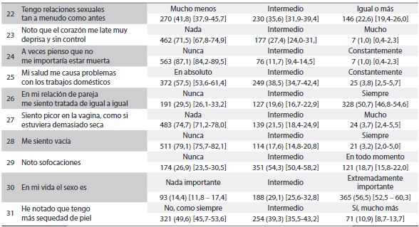 La tercera parte informó que no podían más por el estado de nervios o que las cosas le aburrían. Igual proporción manifestó haber perdido la capacidad de relajarse o notaba que las cosas le daban vueltas. El 28% se sentían hinchadas creyendo que retenían líquidos, el 20% se sentían vacías, el 28% notaban que el corazón les latía de prisa sin control y el 25% sentían picor a consecuencia de la sequedad vaginal. A dos de cada diez le daba miedo presentar salida espontánea o incontrolada de orina, mientras que el 15% informó sentir que no servía para nada, que no le importaría estar muerta o creían que los demás estarían mejor si ella.
