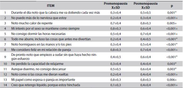 Resultados: edad promedio 48,7±5,7 años, 69,1% con obesidad/sobrepeso, 22,7% con estudios tecnológicos/universitarios y 40,5% posmenopáusicas. Las manifestaciones más prevalentes: oleadas de calor 76,4%; sofocaciones 73,1%; dolor músculo/articular 71,3%; no conseguían dormir 61,8%; sudoración sin esfuerzos 55,8%; sequedad de piel 50,4% y cefalea que aumentaba durante el día 44,2%. La tercera parte no podían por los nervios, las cosas le aburrían, perdieron la capacidad de relajarse o notaban que todo le daba vueltas. El 24,4% tenían menos interés en el sexo y 14,4% tenían sexualidad nada importante. Las posmenopáusicas tuvieron peor puntuación en la mayoría de las manifestaciones y en los dominios salud, psíquico, sexualidad, relación de pareja, vasomotores, salud, envejecimiento y global.