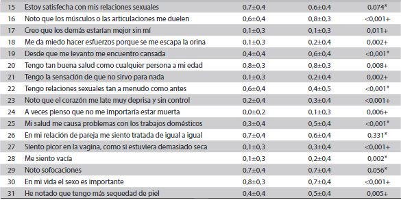 EC al poseer subdominios y dominios permite explorar holísticamente los estados menopaúsicos en particular y el climaterio en general, para identificar aspectos del deterioro de la CV, más allá de solo la presencia de síntomas6. Entre las afrocolombianas estudiadas que aún menstruaban, la puntuación del dominio menopausia y salud fue 17,7±11,9, mientras que entre las que habían dejado de menstruar fue 23,8±11,8, lo que permite señalar que las ultimas tiene mayor deterioro que las primeras, por tanto en ellas debiesen generarse mayores acciones de atención en salud.