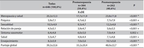 Las mujeres fueron agrupadas según estados menstruales, Tabla 3 presenta puntuación media con desviación estándar de cada manifestación. No se observó diferencia significativa en: “estar satisfecha con las relaciones sexuales”, “sentirse tratada de igual a igual en la relación de pareja” y “notar sofocaciones”. Las preguntas: “el interés por el sexo se mantiene como siempre”, “considerarse feliz en la relación de pareja”, “tener relaciones sexuales tan a menudo como antes” y “en la vida el sexo es extremadamente importante”, tuvieron peor evaluación en premenopáusicas (p<0,005). A su vez las posmenopáusicas tuvieron peor evaluación en las otras 24 preguntas, con diferencias significativas, siendo las de peor puntuación: “notar mucho calor de repente” y “notar que las articulaciones duelen”. La puntuación para toda la población fue: 39,2±22,6, siendo peor en posmenopáusicas (p<0,001), quienes tuvieron peor puntuación en todos los dominios y subdominios que las premenopáusicas (p<0,001). Tabla 4. De las estudiadas, 257 (39,7%) tuvieron puntuación por encima de la media.