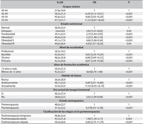 Mayor rango de edad fue factor asociado no ajustado a puntuación por encima de la media de EC, siendo significativo en todos los grupos etarios, OR: 11,3 [IC95%:6,8-18,6] para 55-59 años. Igual comportamiento tuvo infrapeso, sobrepeso, obesidad en diferentes categorías, menos de 12 años de educación, fumar anteriormente y en la actualidad, ausencia de uso de terapia hormonal y posmenopausia (p<0,001). La postmenopausia tardía y alejada, fueron factores asociados espectivamente a dos y cinco veces puntuación por encima de la media, que postmenopausia temprana. Tabla 5.