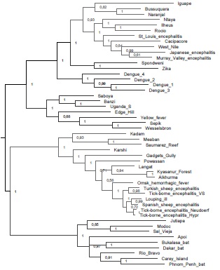 Los corchetes a la derecha indican el tipo de vector que transmite cada subgrupo de virus, ya sean mosquitos de los géneros Culex o Aedes, o garrapatas. Los números próximos a cada nodo indican la probabilidad posterior del clado correspondiente. El análisis fue realizado en el programa MrBayes 3,2 utilizando el modelo GTR+G+I y fue corrido por 1.000.000 de generaciones. El árbol está enraizado en el punto medio y fue editado en el programa FigTree 1.4.