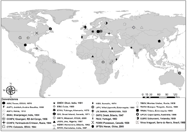 Los símbolos indican la ubicación y la fecha del primer aislamiento. Las siglas de los virus son las siguientes: ABV, Virus Aransas Bay; AHFV, Virus de la fiebre hemorrágica de Alkhurma; ASFV, Virus de la fiebre porcina africana; BHAV, Virus Bhanja; CCHFV, Virus de la fiebre hemorrágica de Crimea-Congo; CTFV, Virus de la fiebre por garrapatas del Colorado; DHOV, Virus Dhori; ERV, Virus Estero Real; EYAV, Virus Eyach; GIV, Virus Great Island; HRTV, Virus Heartland; JOSV, Virus Jos; KEMV, Virus Kemerovo; KFDV, Virus de la enfermedad de los bosques de Kyasanur, KISV, Virus Kismayo; LIPV, Virus Lipovnik; LIV, Virus Louping ill; OHFV, Virus de la fiebre hemorrágica de Omsk; PALV, Virus Palma; POWV, Virus Powassan; SFTSV, Virus del síndrome de la fiebre severa con trombocitopenia; TBEV, Virus de la encefalitis transmitida por garrapatas, THOV, Virus Thogoto; TBRV, Virus Tribeč; UPOV, Virus Upolu. UUKV, Virus Uukuniemi.
