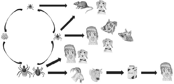 1) Las garrapatas del género Ixodes son vectoras del virus, el cual puede ser transmitido transestadial y transovarialmente. 2) Las garrapatas adultas infectadas transmiten el virus a humanos, caninos y ganado por su picadura. 3) El ganado productor de leche puede transmitir el virus en productos lácteos. 4) El consumo de productos lácteos derivados de animales infectados puede ocasionar infección en humanos. 5) La picadura de ninfas infectadas puede transmitir el virus a humanos, roedores, caninos y animales salvajes como zorros y jabalíes. 6) Las larvas juegan un papel limitado en la transmisión del virus a roedores y caninos.