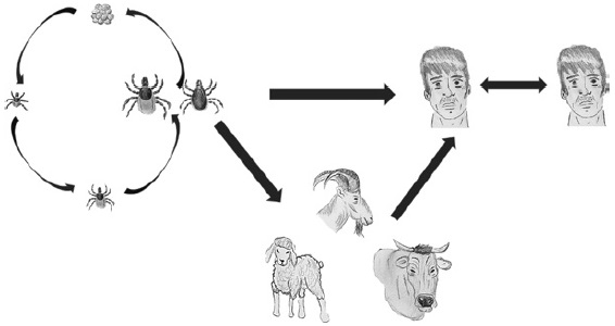 1) El virus es transmitido transestadial y transovarialmente en garrapatas del género Hyalomma. 2) Las garrapatas adultas infectadas infestan animales salvajes y animales de granja transmitiendo el virus. 3) Las garrapatas adultas pueden infestar a los humanos y transmitir directamente el virus. 4) Los humanos pueden adquirir el virus por contacto con animales infectados mediante procedimientos veterinarios o por transferencia de garrapatas infectadas 5) El virus puede transmitirse entre humanos por contacto con fluidos o tejidos de personas infectadas o por el paso de garrapatas infectadas de una persona a otra.