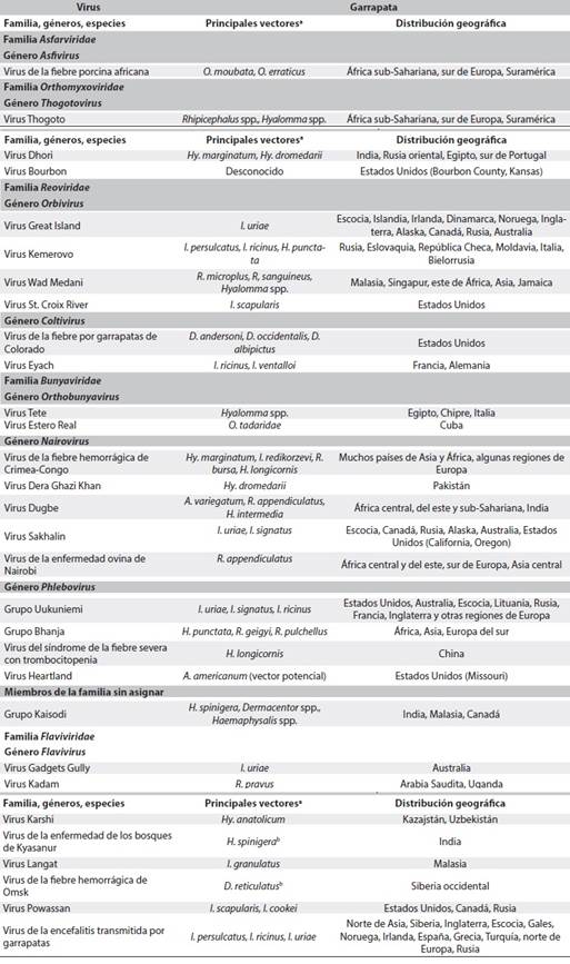 Los virus transmitidos por garrapatas (VTG) pertenecen a las familias Flaviviridae, Bunyaviridae, Reoviridae, Asfarviridae y Orthomyxoviridae, y son causantes de diferentes enfermedades en humanos y animales1. Desde el punto de vista epidemiológico, las dos primeras familias son las más importantes debido a que abarcan la mayoría de los VTG, y agrupan las especies con mayor incidencia y letalidad1)(2)(3. Las enfermedades producidas por estos virus están ampliamente distribuidas en el mundo, pero algunas de ellas están restringidas a ciertas regiones geográficas4.