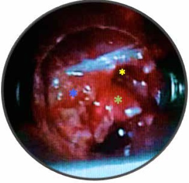 A los 5 días de vida se le hizo, en el servicio de Otorrinolaringología, panendoscopia en la que se evidenciaron una falsa ruta de aproximadamente 3 centímetros en la vallécula derecha, en proceso de cicatrización (Figura 1) y laringomalacia tipo III, que se consideró responsable del evento breve resuelto de causa inexplicable (BRUE, por la sigla en inglés de Brief Resolved Unexplained Event); no se observaron lesiones sincrónicas. Por tal motivo se procedió a hacerle una ariepiglotoplastia, inicialmente izquierda durante el mismo procedimiento. Catorce días después se hizo la ariepiglotoplastia derecha, durante la cual se observaron cicatrización adecuada de la herida en la vallécula derecha y resultados satisfactorios del primer procedimiento laríngeo.