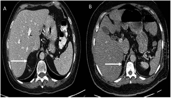 Al examen físico, con tendencia a la hipotensión, leve tinte ictérico, corazón arrítmico con déficit de pulso, sin soplos, con mínimo dolor a la palpación profunda en hipocondrio derecho y hemiabdomen inferior, sin signos de hipoperfusión.