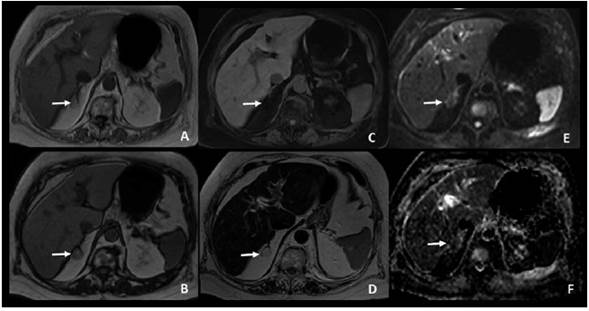 En las secuencias en fase (A) y fuera de fase (B) la señal de la lesión adrenal derecha no cae, lo que indica que no se trata de grasa intracitoplasmática. En el T1 con saturación grasa (C) suprime la grasa de la lesión adrenal. En la secuancia T2 SPIR (D) la lesión muestra la misma intensidad de señal que la grasa abdominal. En las secuencias de difusión DW (E) y mapa de ADC (F) la lesión no muestra restricción a la difusión. Fuente: elaboración propia