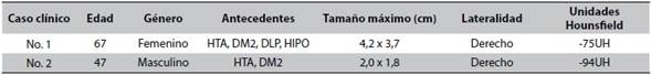 Se revisaron un total de 4.288 estudios tomográficos correspondientes a 3.709 pacientes. Se encontraron 151 lesiones adrenales y se excluyeron 43 lesiones que no cumplían con la definición de masas adrenales incidentales. En total se diagnosticaron 108 masas adrenales incidentales, de estas, tres casos fueron reportados como mielolipomas suprarrenales. Las TAC de abdomen de los tres casos previamente determinados como mielolipomas se revisaron nuevamente por dos radiólogos del Hospital Universitario San Vicente Fundación, quienes concluyeron que uno de los casos no cumplía con las características de mielolipoma y, que correspondía a una lesión metastásica de tumor primario en pulmón. Por último, la prevalencia de mielolipoma como masas adrenales incidental diagnosticado por tomografía abdominal corresponde al 1,85 %. Se describen a continuación las características de los casos encontrados (Tabla 1).