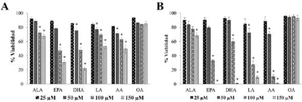 Resultados: la viabilidad relativa por MTT mostró valores ≤ IC50 con las concentraciones mayores (100 y 150 µM) para los ácidos grasos omega-3 EPA y DHA y omega-6 AA (150 µM), mientras que la viabilidad relativa, evaluada con Azul de Tripano, con estos mismos ácidos, redujeron la viabilidad a 0 %. DHA y EPA mostraron efecto genotóxico y la disminución de la clonogenicidad celular (p < 0,01). Por otro lado, LA y AA disminuyeron la viabilidad relativa observada con Azul de Tripano, sugiriendo diferentes mecanismos de acción de los ácidos grasos en la membrana celular.