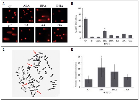 Las células de cáncer de próstata PC-3 tratadas con EPA, DHA y AA permitieron evaluar el número promedio de intercambios entre cromátidas hermanas en cada metafase analizada. Las células PC-3 tratadas con EPA (50 µM) mostraron incremento significativo (16,0 ± 5,5 ICHs/metafase) en el promedio de ICHs/ metafase, comparados con el control negativo (6,3 ± 1,9 ICHs/metafase) (Figura 2, D), consistente con los resultados de genotoxicidad observados en el test cometa alcalino. El promedio del número de ICHs encontrado en el tratamiento con EPA fue mayor (12,7 ± 4,8 y 8,5 ± 1,5 ICHs/metafase) que el obtenido con DHA y AA, respectivamente.