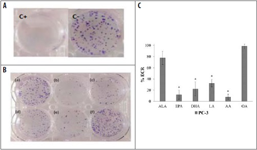 Conclusión: los resultados mostraron que los ácidos grasos omega-3, EPA, DHA, y omega-6, AA, disminuyen la formación de colonias, reducen la viabilidad celular y aumentan el efecto genotóxico respecto al control no tratado, en el modelo in vitro de células tumorales de próstata PC-3.