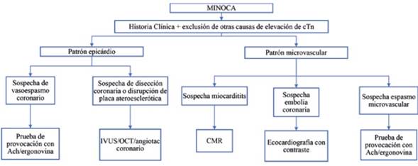 El MINOCA es un diagnóstico de trabajo con múltiples etiologías asociadas (epicárdicas y microvasculares), las cuales es importante identificar, puesto que cambia el pronóstico de éstos pacientes, además del impacto del tratamiento, en su morbimortalidad a largo plazo.