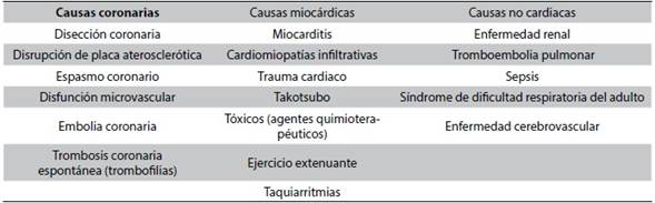 Para esto, inicialmente se deben obtener datos importantes de la historia clínica para guiar la búsqueda: antecedentes de enfermedad viral reciente, enfermedades autoinmunes, trauma psicológico/emocional previo al episodio, antecedentes familiares de trombofilias, medicamentos, uso de drogas psicoactivas y características del dolor torácico. Posteriormente, hay que recordar que la elevación de troponinas no es específica de enfermedad coronaria, por lo cual se deberían excluir causas potenciales no isquémicas de su elevación (Tabla 1) como: enfermedad renal, miocarditis, sepsis, tromboembolia pulmonar, trauma, quemaduras, entre otras. La mayoría de estas condiciones son fáciles de excluir en el escenario clínico3,8,9.